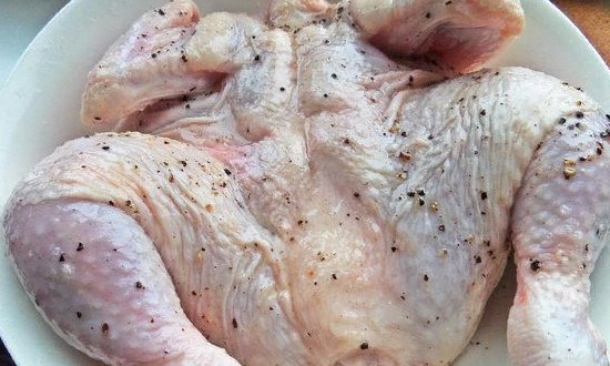 1. Птицу делим пополам с одной стороны. Разминаем её руками, выкручивая слегка суставы. Обтираем полностью солью и чили-порошком. Даем полежать полчаса.