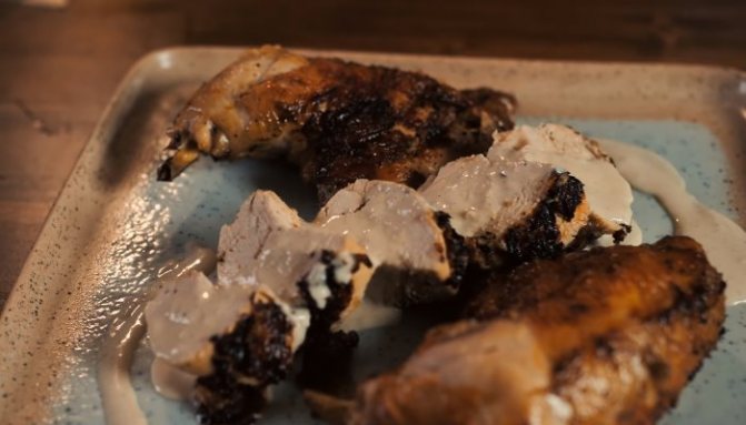 3. Вынимаем тушку, а в сковородку льём сливки, выдавливаем чеснок, приправляем приправками и присаливаем. В полученный соус кладем мясо и ставим в духовку на четверть часа при 180 градусах.
