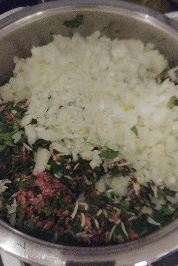 - Перемелену баранину змішати з круглим вимитим рисом, пасеруванням цибулі, рубаним кропом і кинзою.