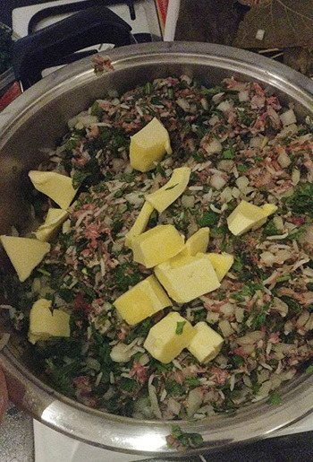 - Цибулини порубати кубиком, часник пропустити через прес, свіжу зелень подрібнити. Обсмажити на сковороді зі олією, хвилин через 6 закинути в масу фарш та спеції. Вимішати.