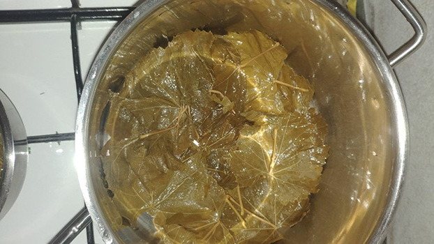 - У киплячу воду викласти виноградне листя на півхвилинки. Потім відкинути на друшляк, дати рідини стекти.