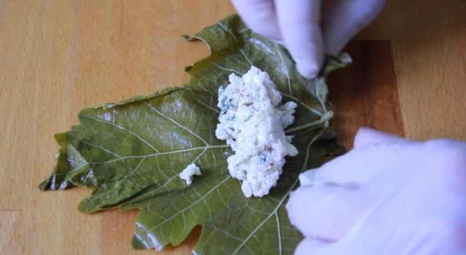 - На виноградне листя викласти столову ложку сирно-злакового асорті, надати форму.