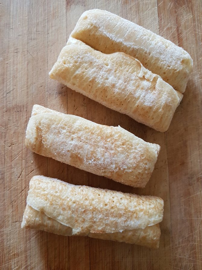 Інгредієнти тіста замішують міксером. Дають постояти півгодини та випікають млинці.