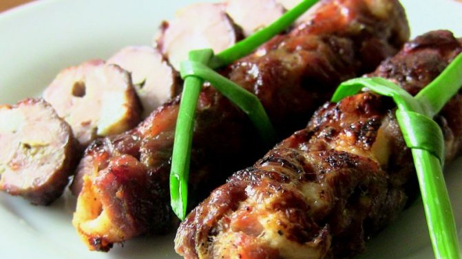 Ця страва — дієтична, але дуже смачна. Кроляче м’ясо багате на вітаміни і мінерали і містить невелику кількість холестерину і жиру. Таку домашню ковбасу можна давати дітям! Для її приготування вам знадобиться м’ясо кролика – 1 кг, яйце куряче – 1 шт., Сухе коров’яче молоко – 1,5 ст. л., сіль – 0,5 ч. л., мускатний горіх та лавровий лист. Розповідаємо, як приготувати домашню ковбасу: спочатку обмиємо тушку кролика та зріжемо з неї все м’ясо. Пропустимо шматочки через м’ясорубку три рази – у вас має вийти однорідна пишна маса. Викладаємо її в миску, додаємо сіль, яйце, сухе молоко, мускатний горіх. Добре перемішуємо. Якщо фарш виходить щільним – додаємо холодної води. Після чого відправляємо суміш у холодильник. Через три-чотири години дістаємо фарш і приступаємо до формування ковбасок. Відрізаємо шматок харчової плівки, викладаємо на неї 1/4 частину фаршу. Надаємо заготівлі довгасту форму. Повертаємо плівкою, намагаючись якомога щільніше її зафіксувати. Кінці зав’язуємо ниткою. У вас виходить заготівля, що за формою нагадує цукерку в обгортці. За аналогією формуємо ще кілька ковбасок з фаршу, що залишився. Тепер потрібно проварити їх на маленькому вогні протягом 1,5-2 годин. Після чого ковбаски виймаємо, охолоджуємо та ставимо в холодильник. Через дві години дістаємо їх та розрізаємо плівку. Тепер ви знаєте, як готується смачна та корисна ковбаса своїми руками без кишок. Приємного апетиту!