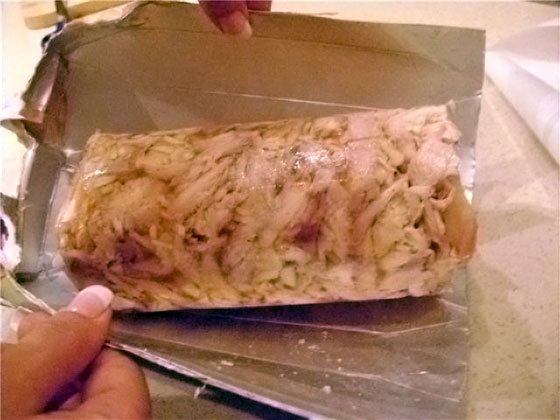 Розкажемо далі, як робиться домашня ковбаса без кишок. Рецепт нескладний. Спочатку обробимо м’ясо – обмиємо та поріжемо на невеликі кубики. Болгарський перець почистимо, нашаткуємо соломкою. Моркву відваримо і наріжемо. Волоські горіхи та часник очистимо, а потім подрібнимо. У глибокій мисці змішаємо рубане м’ясо птиці, горіхи та овочі. Туди ж додамо приправу, сіль, часник, желатин швидкорозчинний (його не потрібно попередньо розводити). Добре перемішаємо усі інгредієнти.