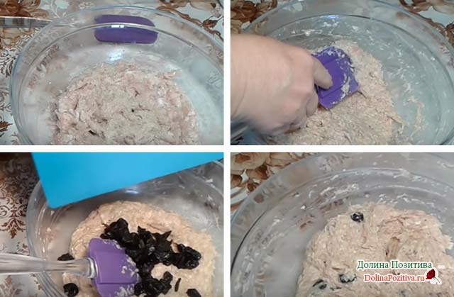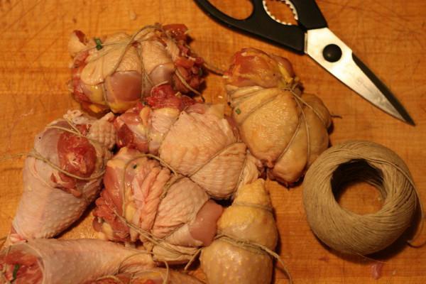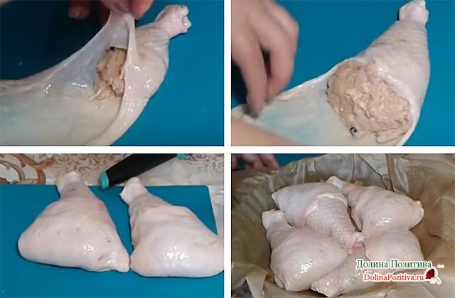 7. На цей час курка промаринується. Беремо шматочок, викладаємо начинку (1-2 ложки) і з’єднуємо краї, надаючи форму голяшки.