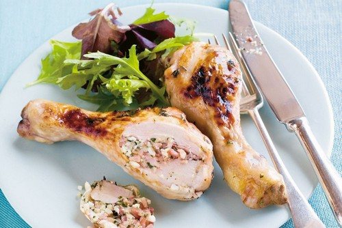 • Звичайно, з фаршированими стегенцями доведеться повозитися: зняти шкіру, обрізати м’ясо з кісток, подрібнити фарш, знову набити шкуру і тільки потім запекти – це займе набагато більше часу, ніж просто приготувати курячі стегенця в духовці.