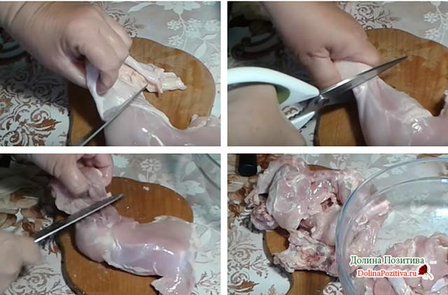 1. Знімаємо м’ясо повністю з кістки. Розрізаємо спочатку м’якоть уздовж кістки, потім відокремлюємо м’ясисту частину по колу. Забираємо сухожилля.