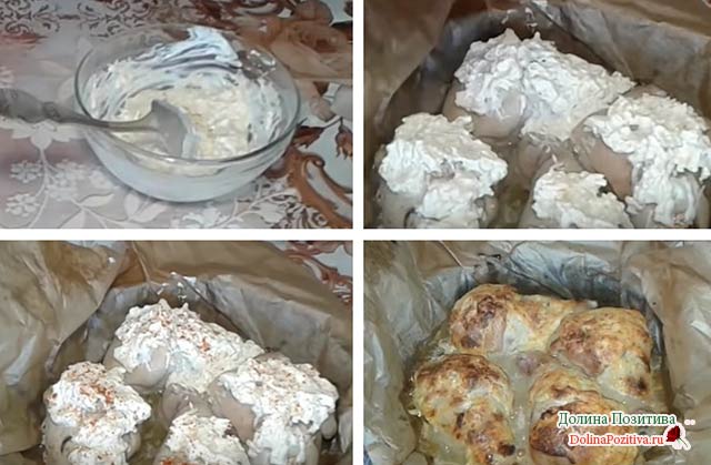 5. В окремій мисці з’єднуємо майонез, кетчуп та гірчицю. Рясно змащуємо отриманим соусом ніжки. Духовку розігріваємо до 180 градусів. Випікаємо 1 годину.