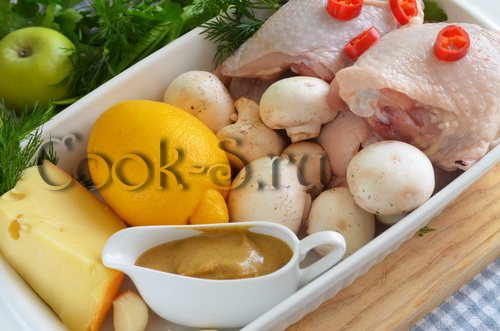 Інгредієнти для приготування курячих стегон, фаршированих грибами: