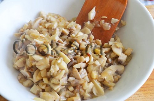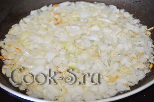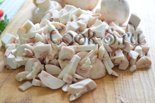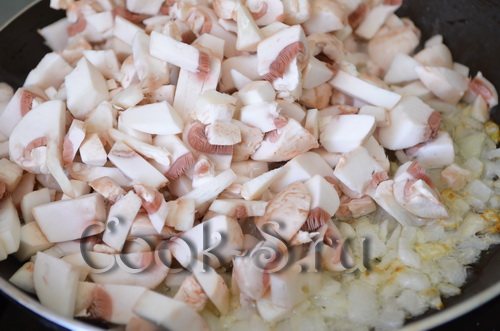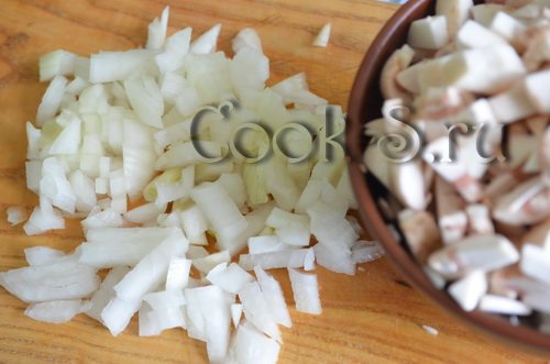 1. Цибулю шаткуємо тонкими кубиками і пасируємо. Дрібно нарізаємо гриби та відправляємо до цибулі. Обсмажуємо хвилини 3-4.