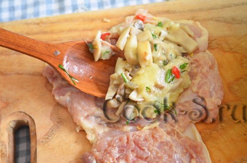 Куряче стегно покласти шкірою донизу, додати грибну начинку.