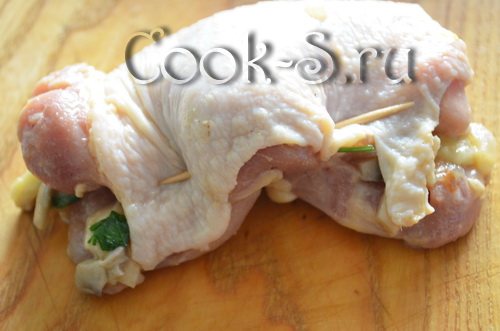 Щоб начинка в процесі приготування не розтеклася – зафіксувати краї фаршированого стегна зубочисткою.