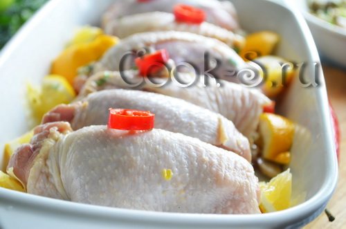 Покласти стегна з грибами в змащену олією форму для запікання, розмістити по краях шматочки відкладеного лимона.