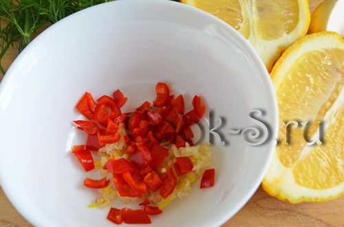У невелику тарілку покласти пропущений через прес часник та подрібнений гострий перчик.