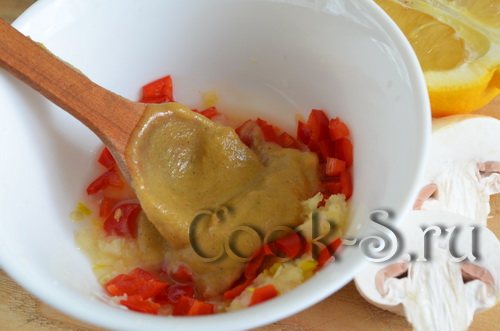 Покласти м’ясо у глибоку тарілку, додати маринад на основі гірчиці. Акуратно натерти маринадом кожне стегно та відправити м’ясо на 30 хвилин у холодильник.