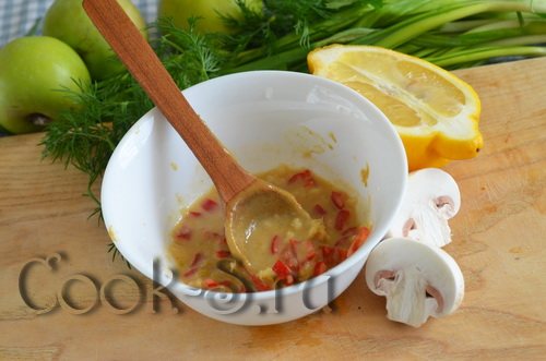 Додати сіль, сік половинки лимона, гірчицю. Шкірку і м’якоть лимона, що залишилася, не викидати, а відкласти вбік.