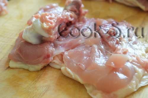 Курячі стегна промити в холодній воді, просушити рушником. Гострим ножем акуратно видалити внутрішню кістку разом із хрящами.
