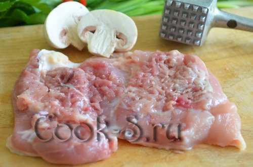 Відбити куряче стегно кухонним молотком. Це робиться для того, щоб його можна було нафарширувати грибною начинкою.