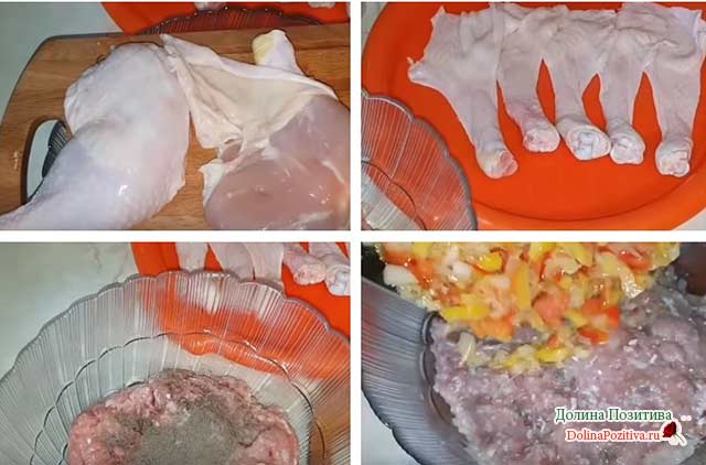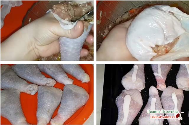 1. Візьмемо курячу ніжку. Знімемо спочатку шкірку разом з м’якоттю з кістки, так щоб вийшов цілісний мішечок. У самому низу, де м’якуш важко відходить, обрубаємо кістку ножем.