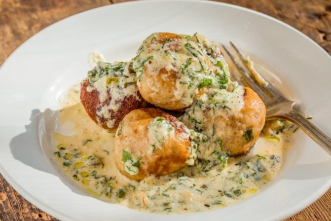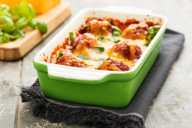 Руками скочують фрикадельки, посипають борошном і викладають у посуд для запікання. Ставлять у духову шафу на п’ятнадцять-двадцять хвилин.