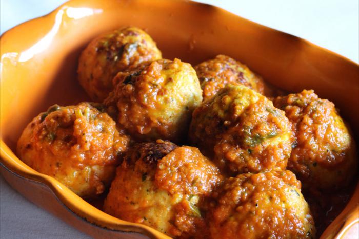 Це вишукані та незвичайні фрикадельки у томатному соусі з яловичини. Для них знадобиться: півкілограма фаршу, 1 ріпчаста цибулина, 1 зубчик часнику, близько 25 г сиру (типу чеддер), 1 яйце, сіль, перець, цукрова пудри (2 маленькі ложки), паніровка (сухарі), оливкова олія і нашаткована дрібніша зелень.