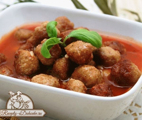 Фрикадельки посипають борошном і обсмажують на сковорідці на повільному газі. Потім перекладають у форму для запікання та заливають томатною пастою, розведеною водою. Солять, додають приправи та лаврові листочки. Запікають у духовці близько двадцяти хвилин.