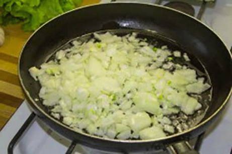 2. Цибулю дрібно наріжте ножем. Обсмажте його на олії до м’якості.