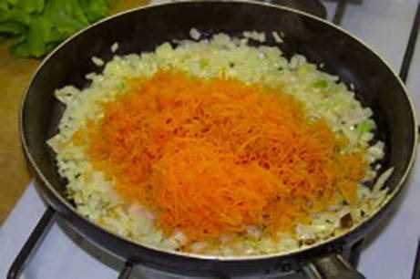 3. Моркву натріть на тертці, додайте|добавляйте| на цибулю на сковороду і смажте 4-5 хвилин|мінути|, періодично помішуючи.