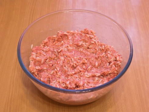 1. Цибулю очистіть і одну цибулину прокрутіть через м’ясорубку. Змішайте фарш, цибулю та куряче яйце. Фарш посоліть і приправте ще раз перемішайте.