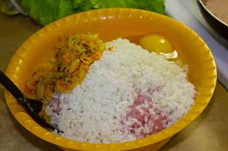3. До фаршу додайте розм’якшену булку, варений рис, сіль та перець, добре перемішайте інгредієнти.