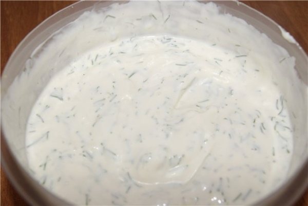 - Окремо необхідно влити в сотейник сметану, змішати її з промитою рубаною зеленню. Масу потрібно посолити на смак і прогріти пару хвилин.