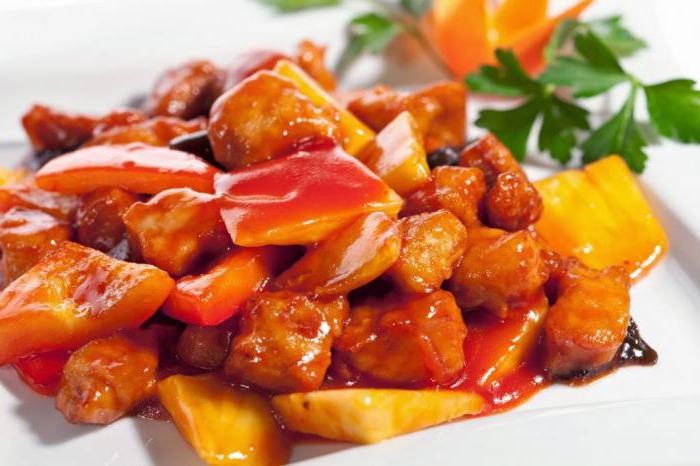 - Для приготування соусу на чисту і прогріту сковороду покласти 50 г цукру, 10 г солі і налити чайну ложку оцтової есенції, швидко все перешкодити, а коли вміст буде плавитися, додати 20 г томатної пасти і пару ложок олії. Все змішується, а коли маса покриватиметься бульбашками, тобто кипіти, то вливається 150 мл води, в якій попередньо розлучається 3 ч. л. крохмалю.