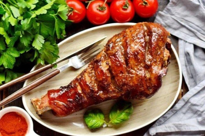 Готовність м’яса продемонструє прозорий сік під час проколу. При подачі гомілки до столу потрібно нарізати її на невеликі шматочки і доповнити овочевим асорті.