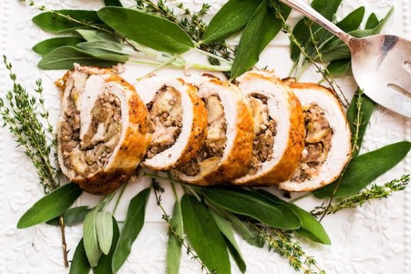 - М’ясо індички розгортається на столі, вкритому фольгою. На нього потрібно викласти всю начинку, після чого згорнути акуратним рулетом. Зверху заготівля обгортається фольгою так, щоб не залишилося отворів, і з них не випливав сік.