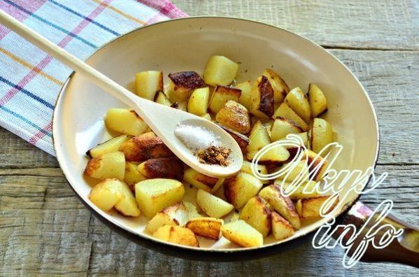На сковороді або в глибокому товстостінному сотейнику розігріти олію і викласти картопляні часточки. Обсмажити на сильному вогні для отримання золотистої скоринки протягом п’яти хвилин. Приправити картоплю сумішшю з перців та сіллю.