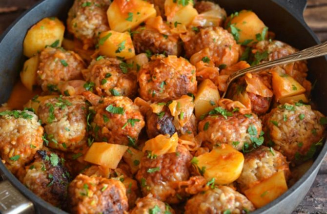 Рецепт 2. Картопля з фрикадельками та квашеною капустою.