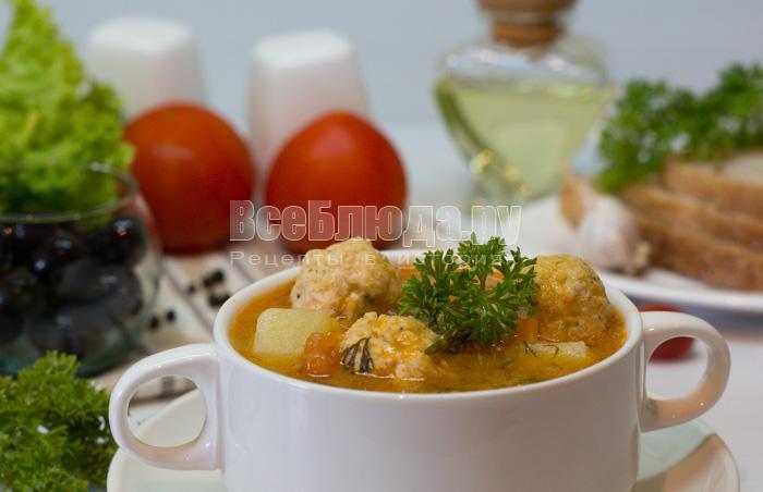 Готовий курячий фарш посолити, поперчити і у вигляді фрикадельок, закидати в каструлю, додати суху зелень.