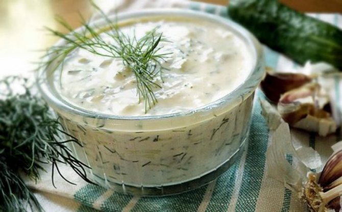 Дзадзіки-соус, в який можна вмочити шматочок хліба або баранини. Це йогурт зі шматочками огірка. Він низькокалорійний та дуже смачний.