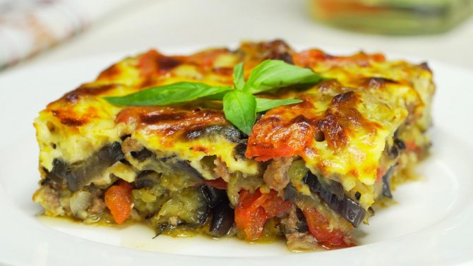 Це м’ясна запіканка із баклажанів. Для її приготування використовується баранина у вигляді фаршу. Також для мусаки необхідні овочі, а саме цибуля, томати, картопля. Страву запікають із сиром та соусом бешамель.