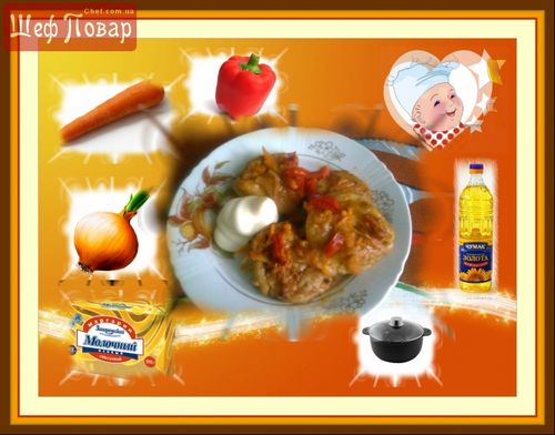 Беремо глибоку сковороду, закладаємо цибулю, морквину і перчик протушковуємо на олії і стежимо, щоб не пересмажилося. Додаємо томатний соус та воду до костинстенції, як на заливку для голубців. Потрібно, щоб заливки було багато. Підготовлену заливку знімаємо з вогню та відставляємо.