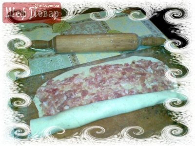 - На цей час тісто вже відпочило, його слід тонко розкотити, надавши форму прямокутника. Першим на поверхні розподілити фарш, поверх викласти овочеве пасерування з тарілки і скрутити рулет, намагаючись не залишати всередині повітря.