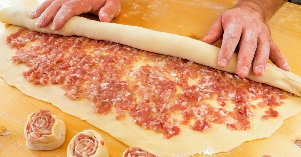 - Тісто потрібно розкотити дуже тонко, рівномірно нанести шар фаршу і згорнути рулетом з широкого боку. Тепер потрібно нарізати стовпчиками заввишки трохи більше 5 див.