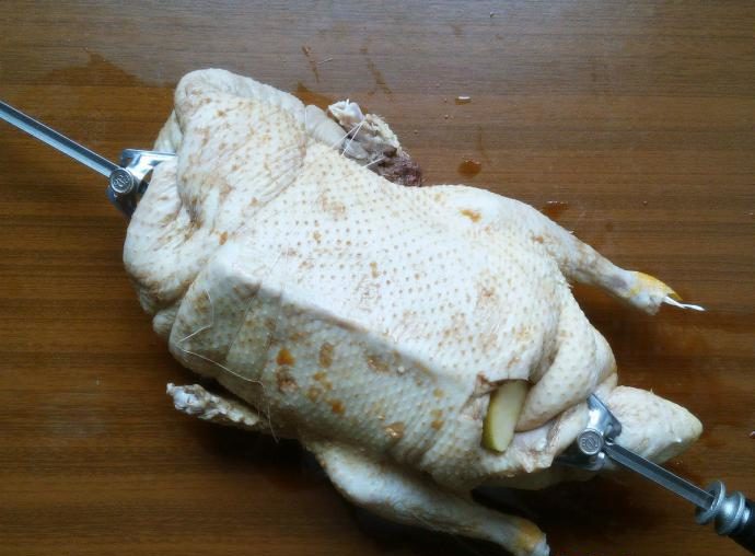 8. Акуратно нанизуємо тушку на рожен, фіксуючи обидва кінці і прив’язуємо ниткою шию та крильця до тушки, так вони не заважатимуть запікатися птиці в духовці.