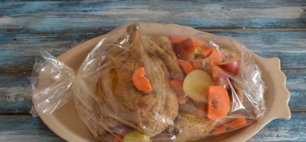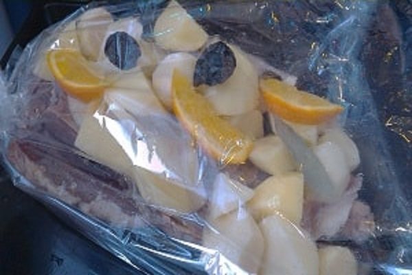 4. Беремо рукав для запікання, на дно кладемо тушку, а зверху та з боків фрукти з картоплею, додаємо лавровий лист. Зав’язуємо обидва кінці.
