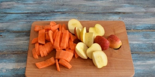 2. Тепер помийте та очистіть моркву, поріжте брусочками чи фігурками. Яблука теж промийте і видаліть серцевину, поріжте на часточки.