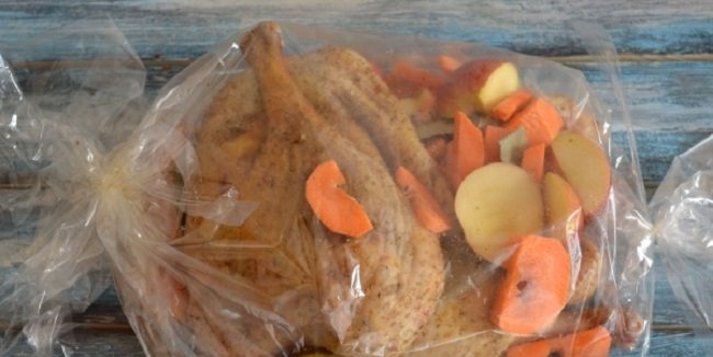 3. Наші овочі та фрукти відправляємо до м’яса та зав’язуємо рукав.