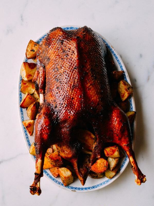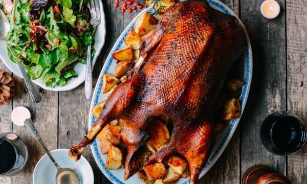 Гусак із картоплею: ​​UGC Гусак, запечений цілком, оточений картоплею та яблуками, — це класична прикраса столу на зимові свята. Рецепт гусака у духовці з картоплею в рукаві забезпечує все, що чекають від цієї страви.