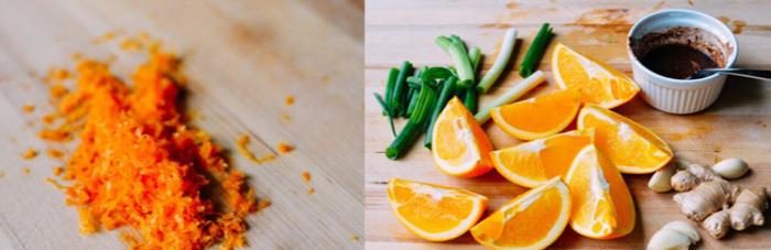 2. Помийте апельсини та акуратно зріжте з них цедру. Подрібніть її на тертці та додайте 1,5 ч.л. солі, цукру, спеції та перець. Залийте суміш вином або соєвим соусом. Добре перемішайте та дайте настоятися. А в цей час птах натріть подрібненим часником і сіллю, нафарширувавши його скибочками імбиру, рубаним пір’ям зеленої цибулі і порізаними на 4 частини апельсинами.