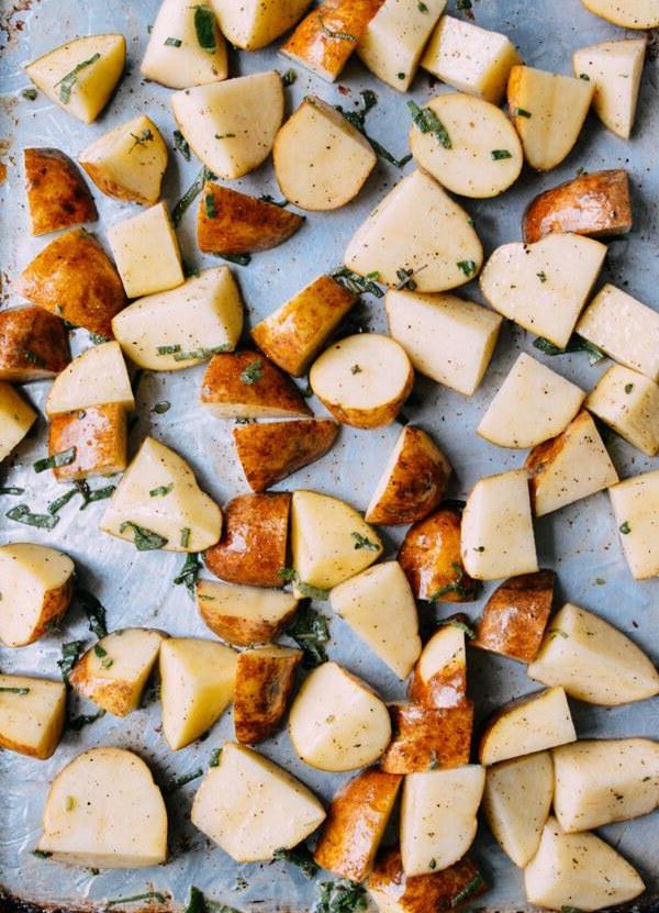 5. Коли пройдемо хвилин 30-40, то починаємо готувати картоплю, промийте її та обсушіть. Чистити від шкірки не треба. Потім нарізаємо овоч великими шматками і перемішуємо його з перцем, сіллю, улюбленими травами. Викладаємо його навколо тушки та поливаємо жиром. Запікаємо разом із м’ясом до готовності страви.